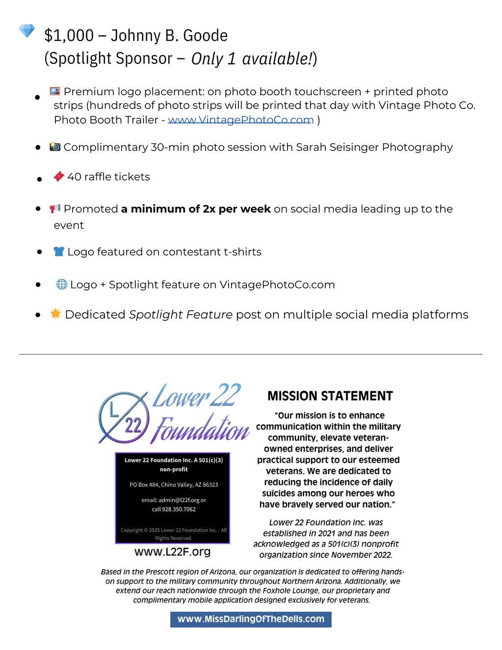 Our fundraiser beneficiary for the 3rd Annual "Miss Darling of the Dells" is the Lower 22 Foundation. Suicide prevention for veterans.